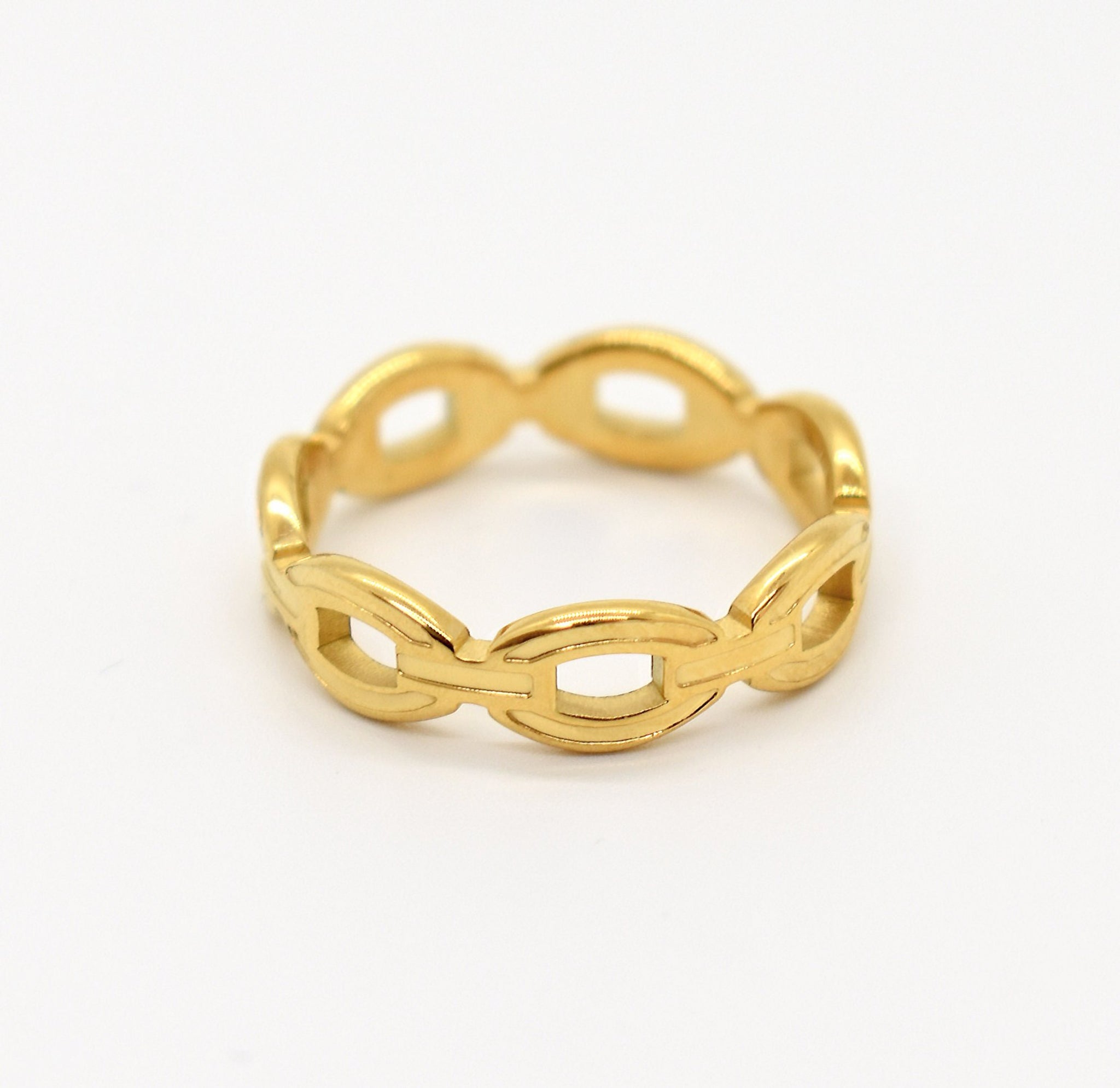 This modern chain ring is plated in 18k gold and exhibits a high polish finish. Trendy and eye-catching, the Dylan ring makes a great low key statement ring for everyday wear!