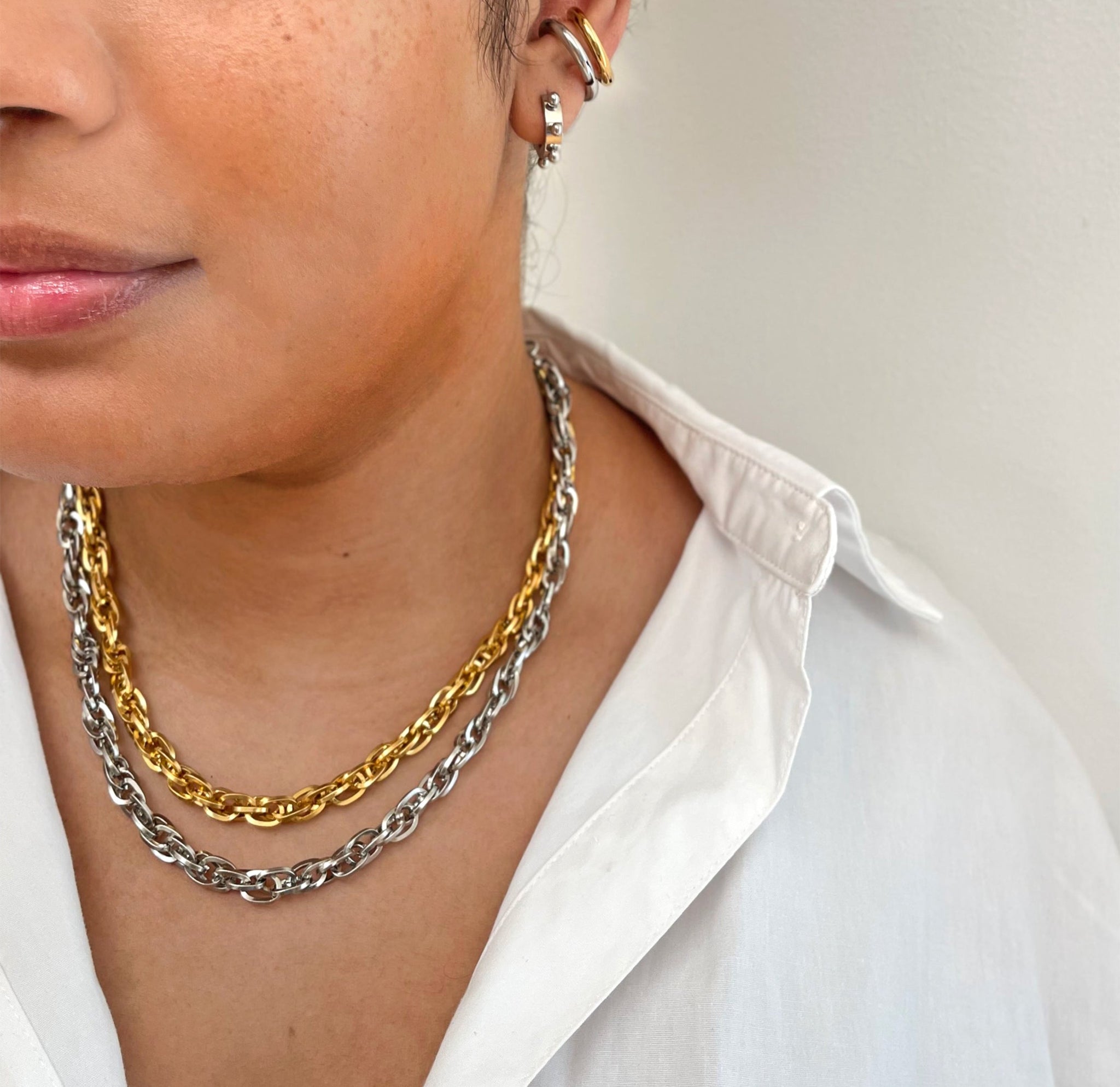 The stunning Gemma Necklace will be a compliment-worthy addition to your silver jewelry collection! The design of this chunky silver rope chain necklace sparkles fiercely and will add a lovely dimension to your necklace stack. The Gemma necklace is silver plated, tarnish resistant, and adjustable! Yes, you can wear her shorter as a choker alone or longer stacked with your favorite necklaces. Also available in gold.