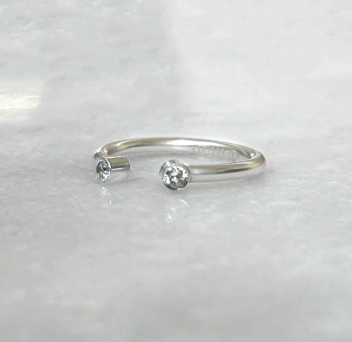 Add some sparkle to your everyday stack with the beautiful Jolie Ring. This minimal statement piece features a open design with two CZ diamond stones on each end. The stainless steel base makes this ring incredibly durable, sweatproof, tarnish resistant, and the high polish finishing gives the perfect touch of luxe to your everyday look.