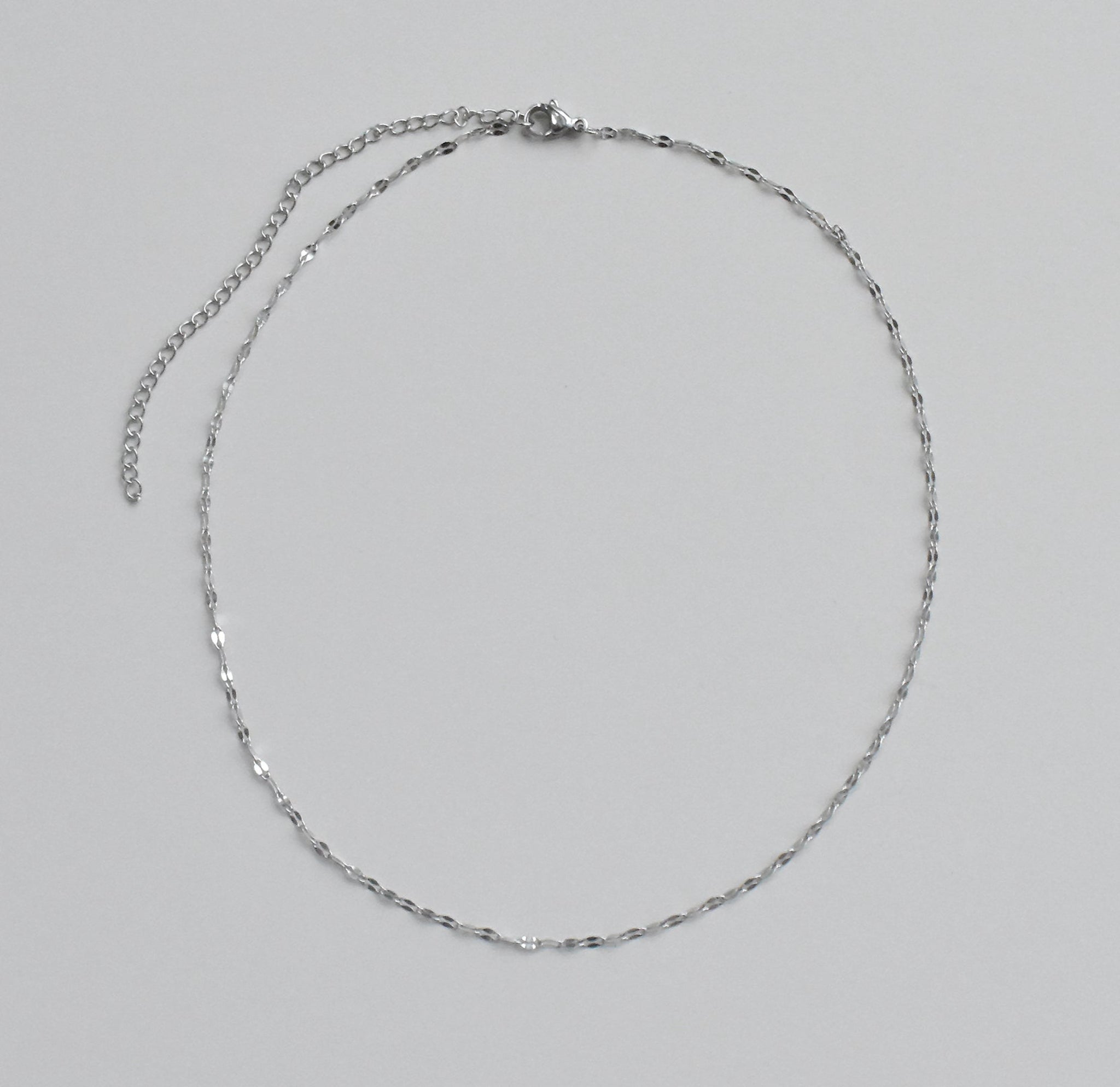 Elsie Necklace: 1.5 mm width. Necklace length is 15” with a 4” extension